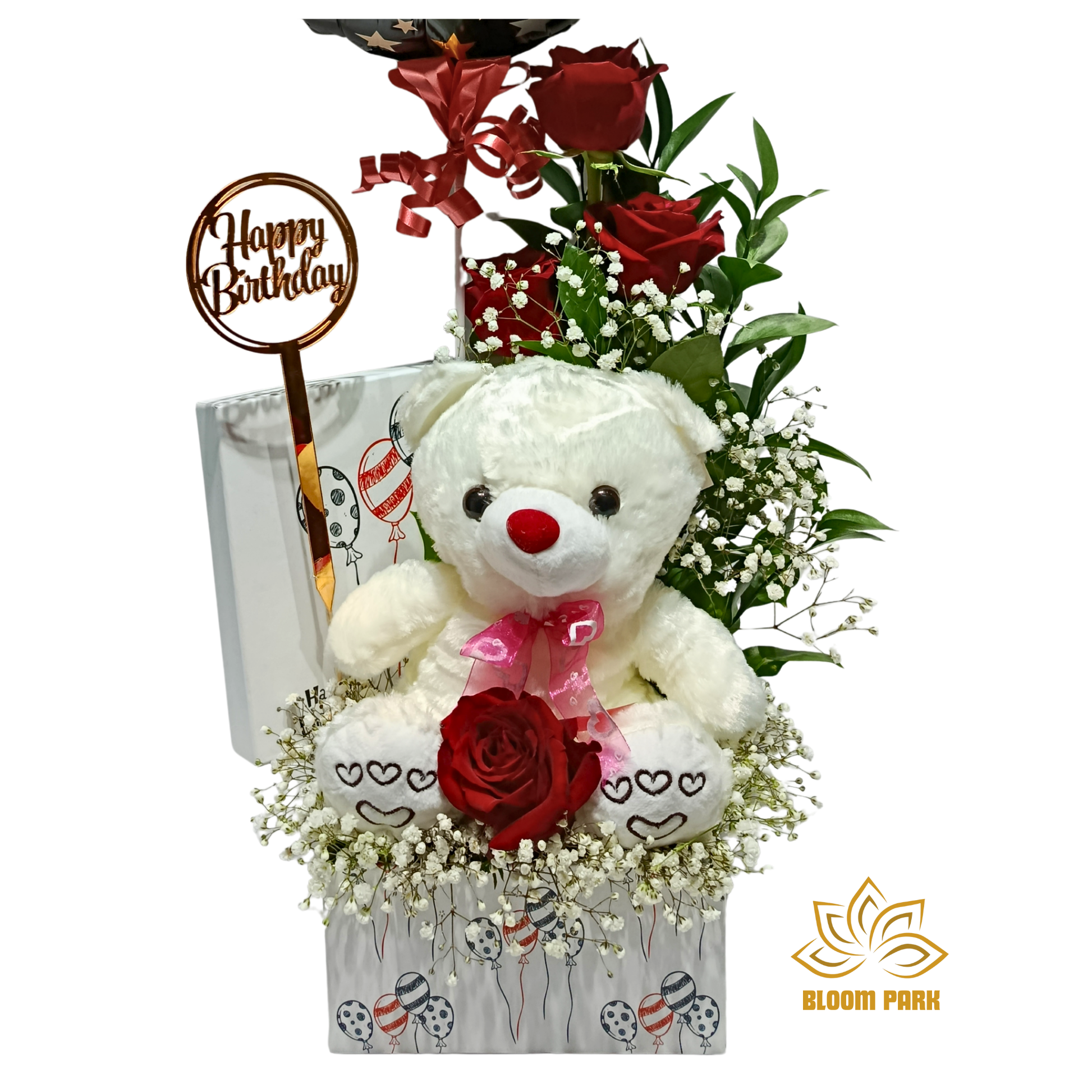 Cute white teddy bear sitting in a patterned gift box with red roses, white fillers and a large black Happy Birthday balloon for an instant celebration display.