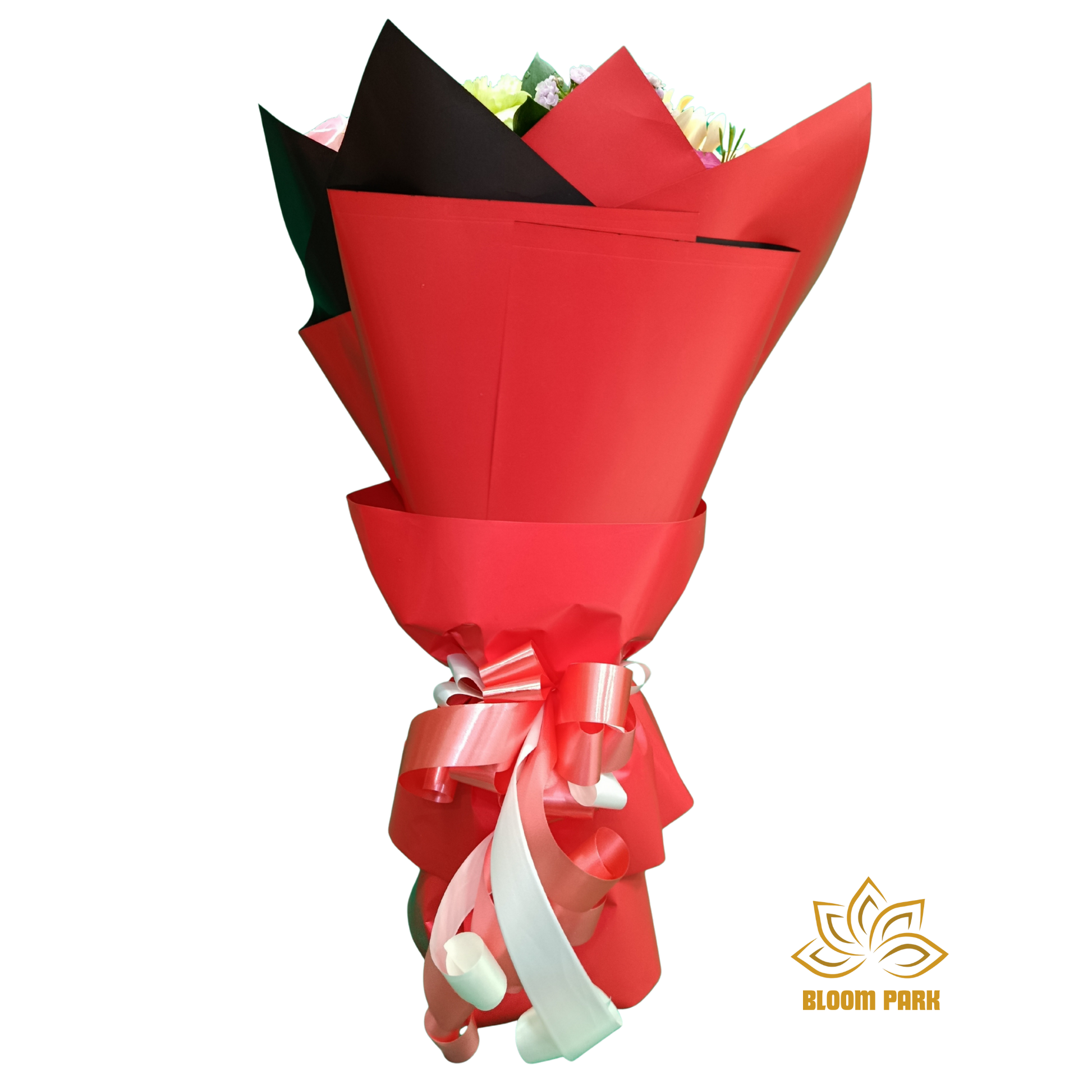 Striking red and black wrap adds visual drama, while the curly red and white bow enhances the bouquet’s festive appeal.