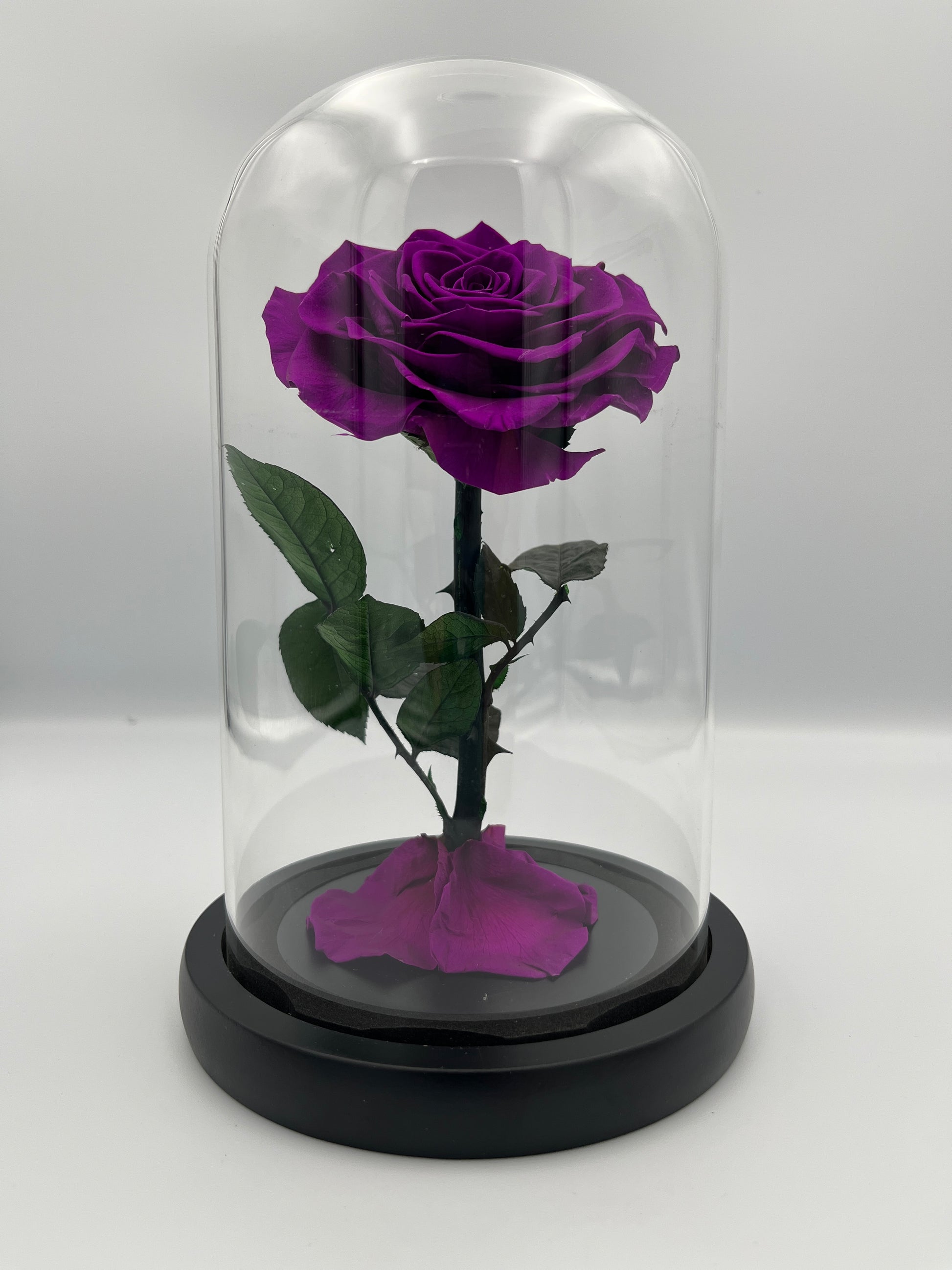 Express elegance and admiration with this beautiful arrangement featuring a single preserved purple rose. Carefully set under a glass dome, this rose maintains its vibrant color and natural beauty for years without the need for water or sunlight. Displayed as a stunning centerpiece or thoughtful gift, the preserved rose is ideal for anniversaries, birthdays, home decor, or special occasions, symbolizing everlasting love and appreciation
