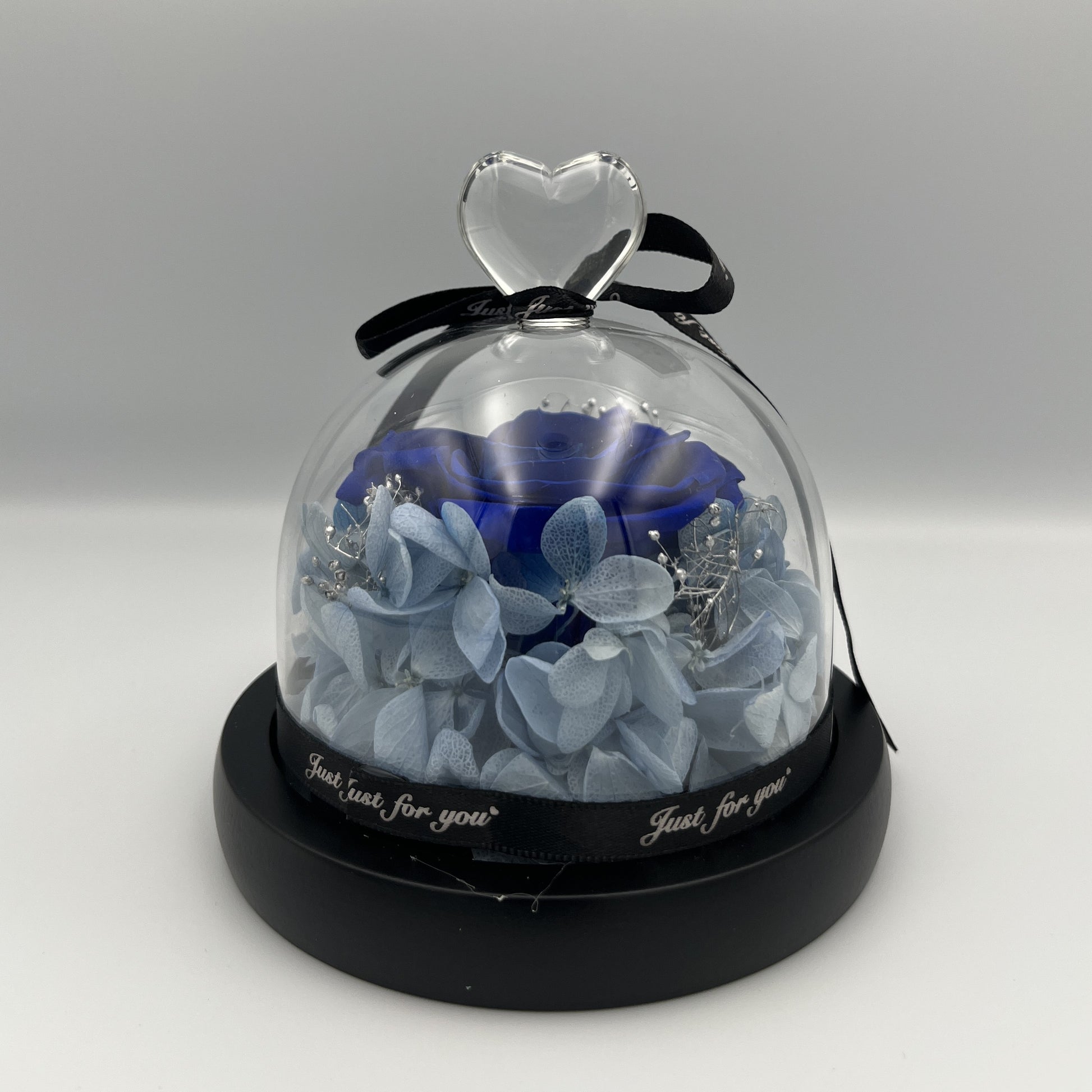A beautiful preserved flower arrangement inside a clear glass dome with a heart-shaped handle on top. Inside the dome, there's a striking deep blue rose surrounded by soft light blue hydrangea petals and some delicate silver decorations. The flowers sit on a black base with a ribbon that says "Just for you." The base likely contains LED lights to softly light up the flowers (though it’s not turned on in the photo).