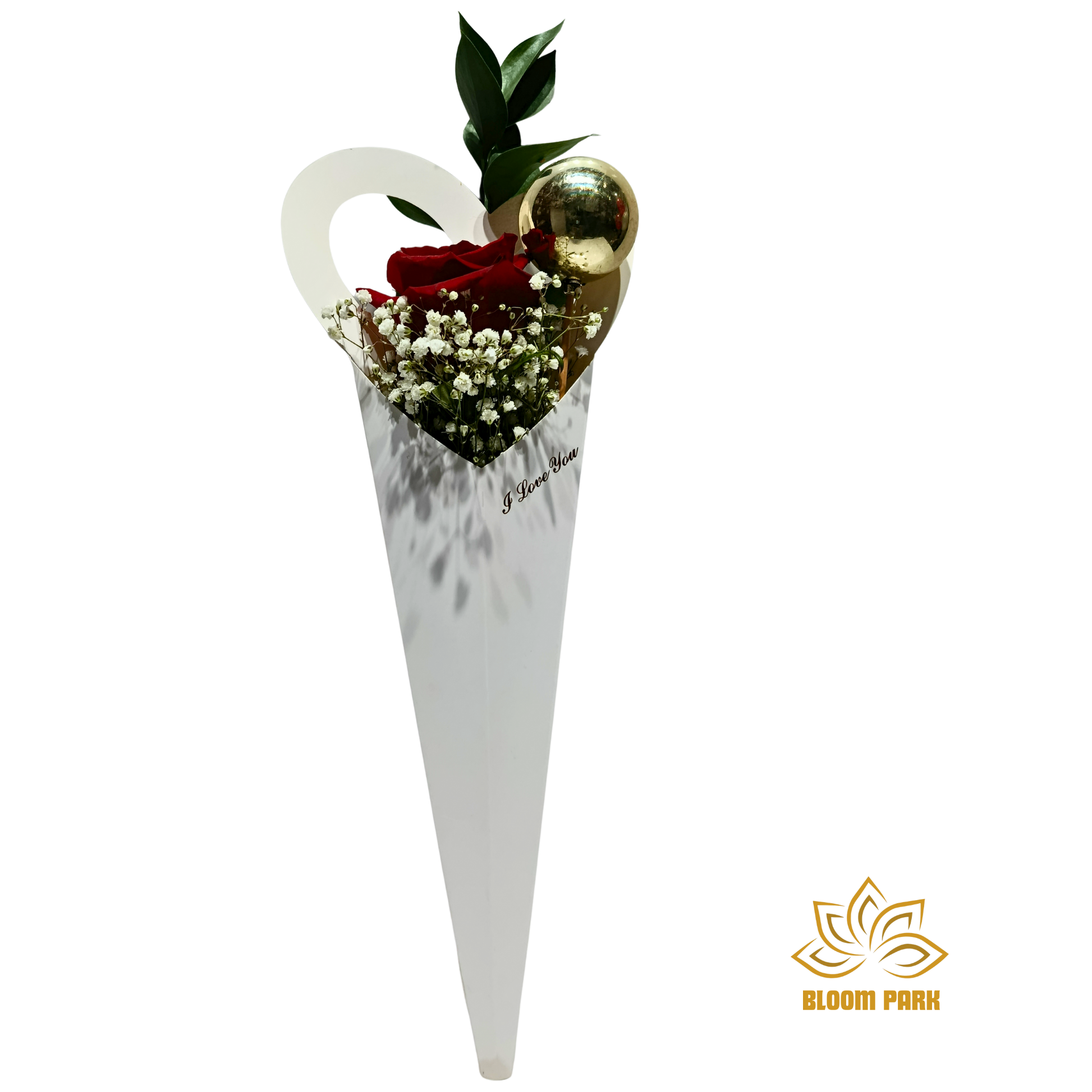 Elegant single red rose with baby’s breath and greenery arranged in a slim white cone sleeve featuring a heart-shaped handle and a small gold decorative ball.